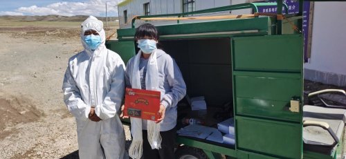 巴桑彭措(左)將錄取通知書送到牧區(qū)孩子手中。(受訪者供圖)