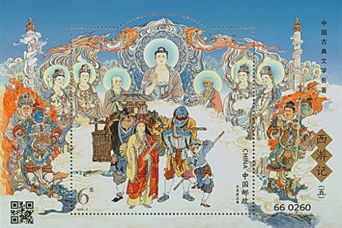 該套郵票是中國郵政自2015年發(fā)行的《中國古典文學名著——〈西游記〉》系列郵票的第五組,描繪了小說第七十四回至第一百回的五段故事場景。4枚郵票分別表現(xiàn)的是,孫悟空在獅駝嶺大戰(zhàn)青毛獅子、黃牙老象、大鵬雕三怪時激烈的打斗場景;孫悟空、豬八戒為救助被當作藥引的比丘國眾孩童,在南極仙翁幫助下收服白鹿精、擒殺白面狐貍的場景;哪吒隨孫悟空去陷空山無底洞,擒獲欲強迫唐僧成親的金鼻白毛老鼠精的場景;孫悟空領(lǐng)著月宮主人太陰星君來到天竺國,收服假冒公主的廣寒宮搗藥玉兔的場景。小型張表現(xiàn)了師徒四人和白龍馬取回真經(jīng)后,真身返回靈山,終成正果的場景。畫家運用傳統(tǒng)工筆重彩的手法,同時注重以形寫神,人物刻畫逼真?zhèn)魃瘢诜酱玳g生動地演繹出大家熟知的故事情節(jié)。