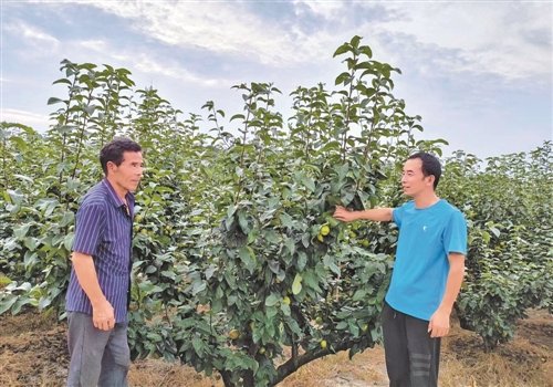 丁丹偉(右)在了解果樹長勢時(shí)與農(nóng)戶交談。