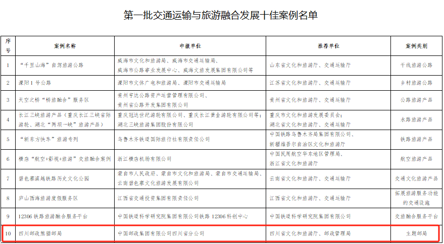 近日,文化和旅游部、交通運輸部、國家鐵路局、中國民航局、國家郵政局、國鐵集團(tuán)共同遴選出第一批交通運輸與旅游融合發(fā)展十佳案例10個和典型案例36個。由四川省文化和旅游廳、四川省郵政管理局推薦申報的“四川郵政熊貓郵局”(以下簡稱為“熊貓郵局”)獲評十佳案例,成為全國郵政管理系統(tǒng)參選案例中唯一獲此殊榮的案例。