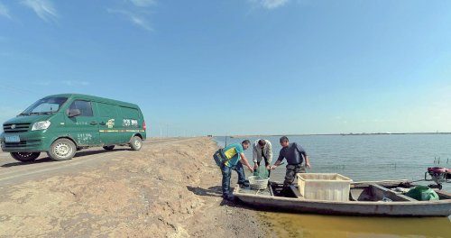 無棣埕口郵政支局投遞員王海進在投遞途中幫客戶倒網收蝦。