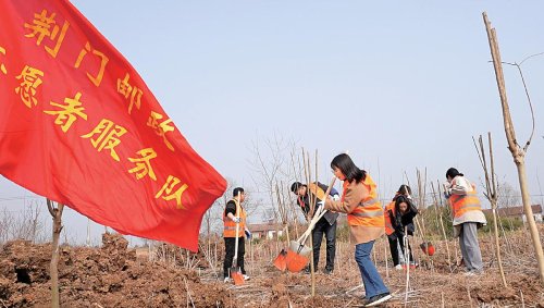在全國第46個義務植樹節(jié)前夕,湖北省荊門市郵政分公司組織黨員、團員青年赴定點幫扶村——沙洋縣五里鋪鎮(zhèn)金臺村開展義務植樹活動。在堰塘堤壩植樹點,大家分工協(xié)作,共種植紫薇200棵,為美麗鄉(xiāng)村建設孕育了新的生機。