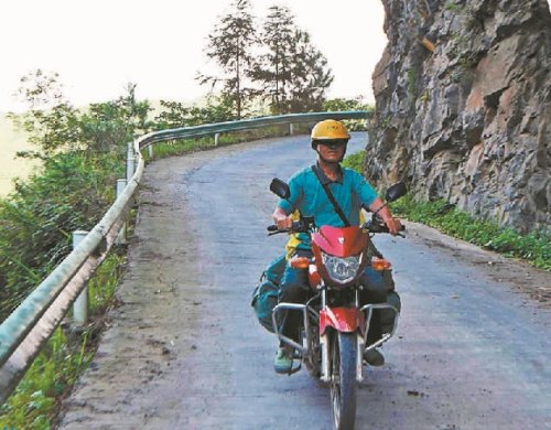 張林昌騎行在貴州省錦屏縣河口鄉(xiāng)培隴村的公路上。楊曉海攝(中經(jīng)視覺(jué))