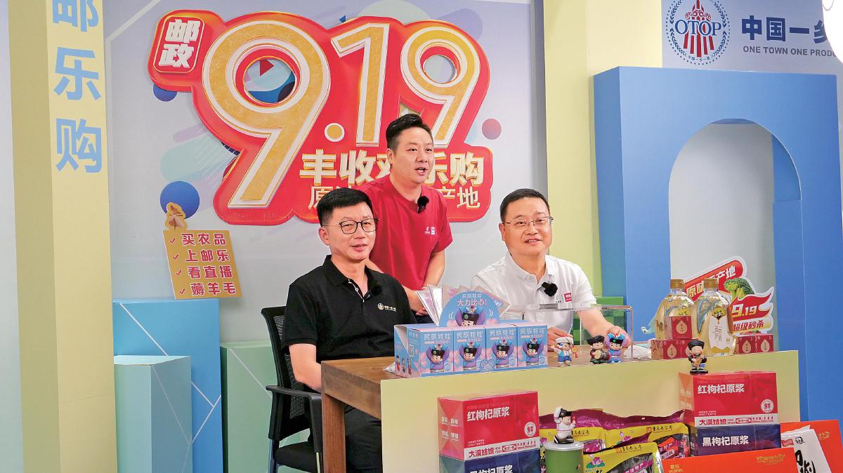 李唐(右)、中國民族貿易促進會會長藍軍(左)走進郵樂直播間為優質農品“帶貨”。