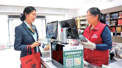 淮安郵政網點人員向煙酒超市收銀員推薦郵惠商圈活動。