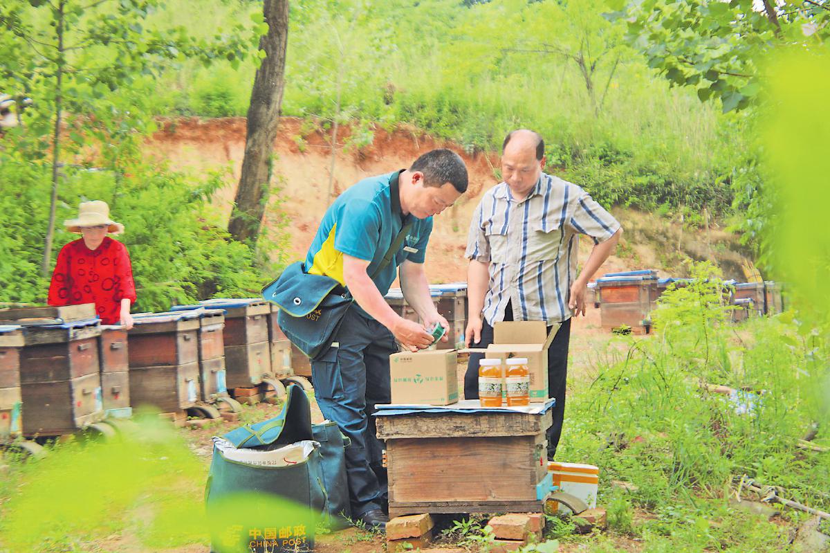 好生態帶來好日子,好“蜂”景帶來好“錢”景。眼下,葉溝村正是山花爛漫的好時節,蜜蜂在花海中忙碌飛舞釀造蜂蜜。一個個封裝好的蜂蜜包裹,載著寇軍紅對美好生活的向往,乘上郵政快車,駛出蜿蜒的山間小路,奔向全國各地。