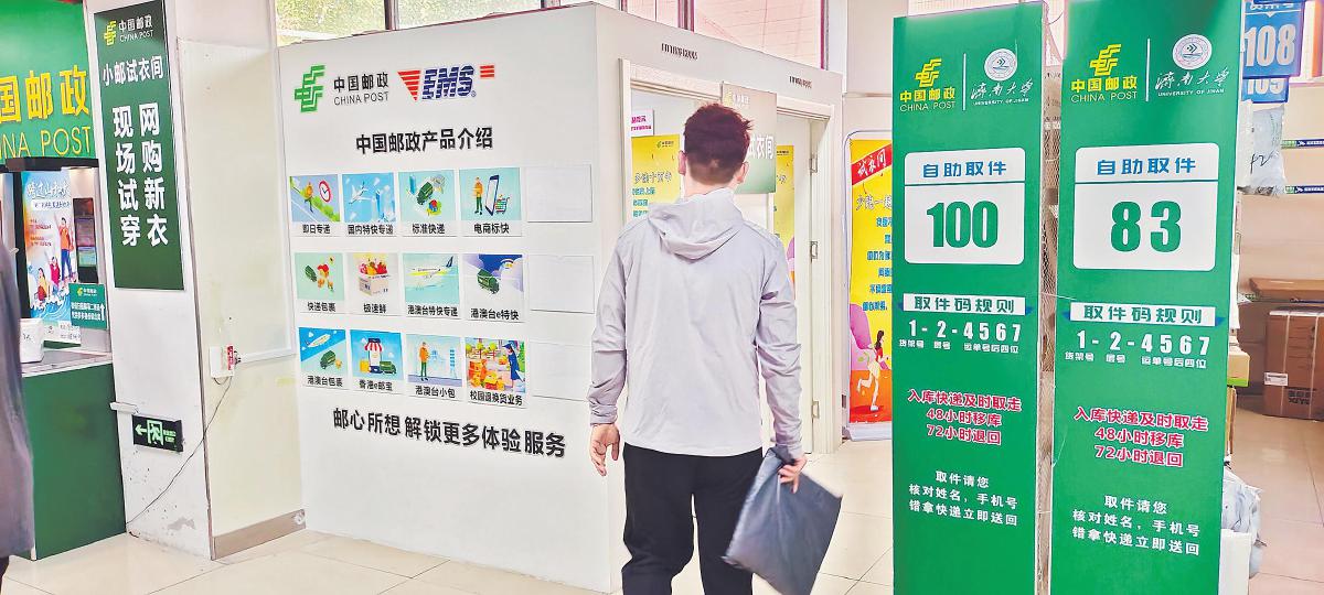 濟(jì)南大學(xué)郵政驛站“小郵試衣間”。□孫明輝 攝