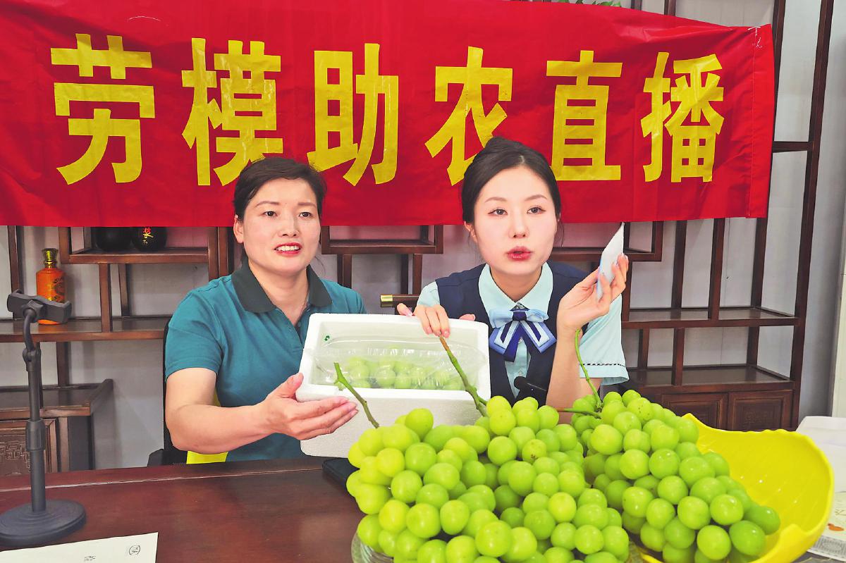 8月22日,安徽省阜陽(yáng)市臨泉縣郵政分公司在白廟鎮(zhèn)魯閣村克偉葡萄種植專(zhuān)業(yè)合作社舉辦高端綠色農(nóng)產(chǎn)品勞模助農(nóng)溯源直播活動(dòng),全國(guó)五一勞動(dòng)獎(jiǎng)?wù)芦@得者、安徽省勞動(dòng)模范劉獻(xiàn)梅(左)走進(jìn)直播間,與郵政主播、觀(guān)眾積極互動(dòng),現(xiàn)場(chǎng)展示、推介原汁原味原產(chǎn)地的陽(yáng)光玫瑰葡萄,2小時(shí)銷(xiāo)售2193件。