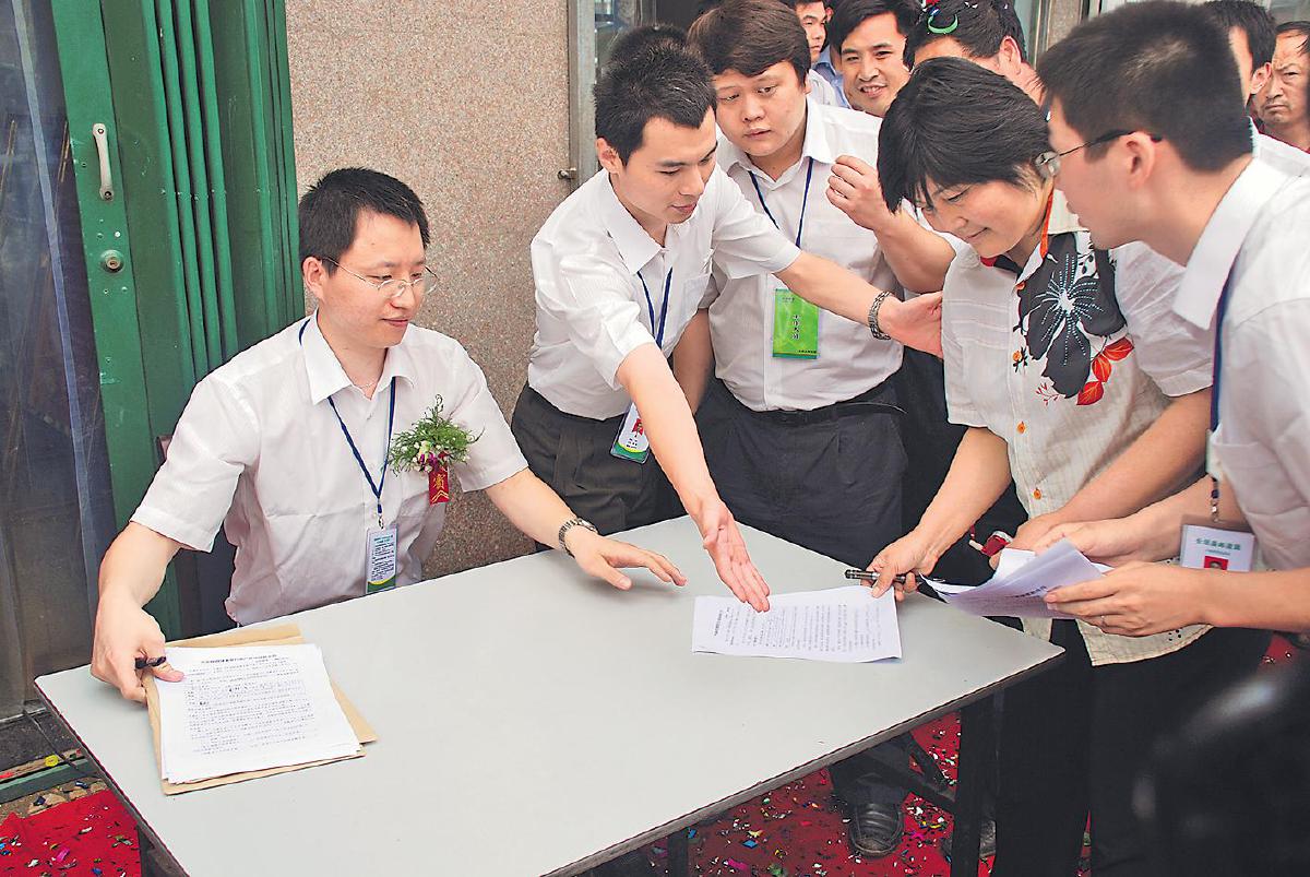 2007年6月22日,郵儲(chǔ)銀行第一位小額貸款客戶董景蓮(右二)辦理借款手續(xù)。