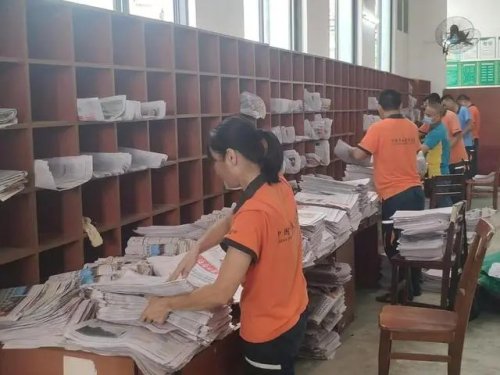 在澄邁縣郵政分公司郵件處理中心,分揀和投遞人員加班加點(diǎn),集體投入臺(tái)風(fēng)期間停運(yùn)的報(bào)紙分發(fā)和投遞工作中,確保第一時(shí)間將報(bào)紙投遞上門(mén),展現(xiàn)郵政速度。