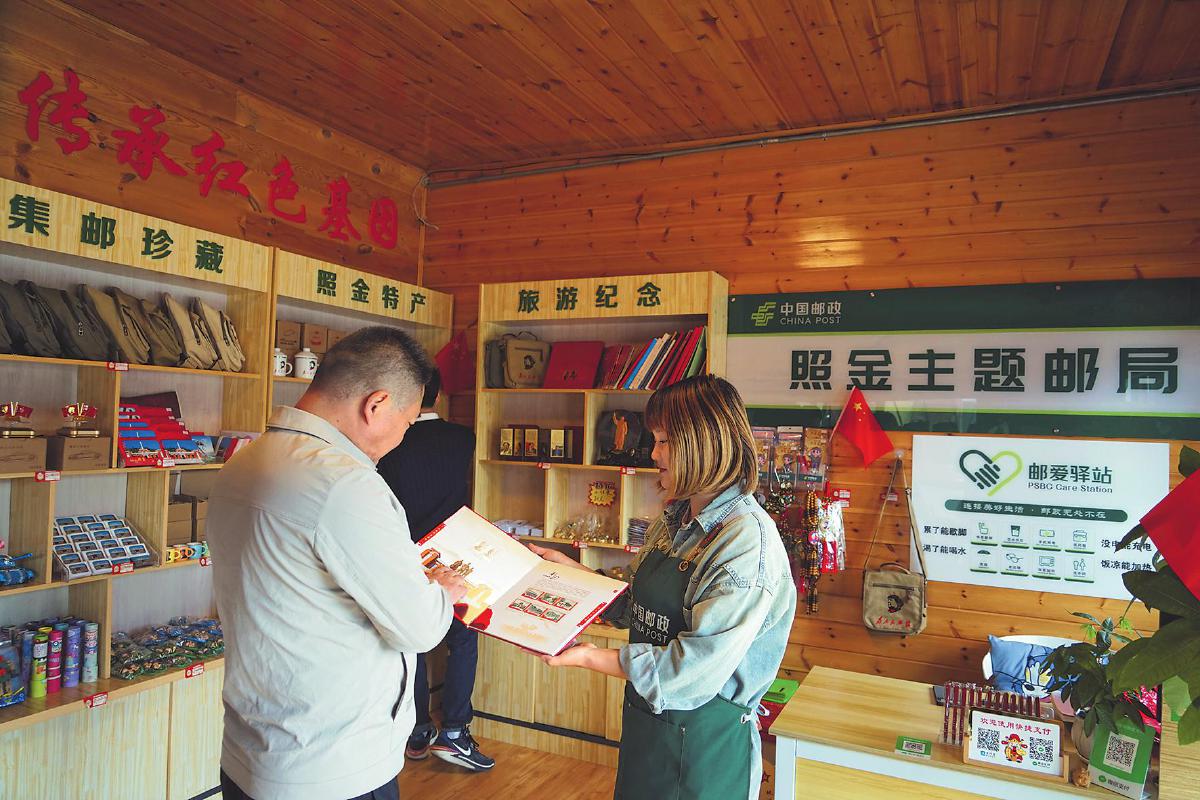 游客在紅色照金主題郵局選購(gòu)郵品。
