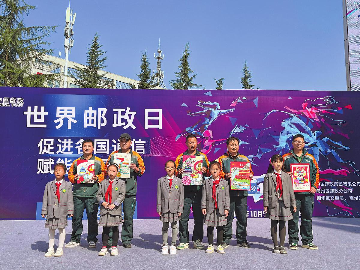 陜西省商洛市郵政分公司舉辦世界郵政日宣傳暨“童心同行 郵政相伴為美好生活加‘郵’”活動,來自商州區第六小學的5位小朋友現場為郵政快遞員送上了精美的手繪作品?! 鯊垶t 攝