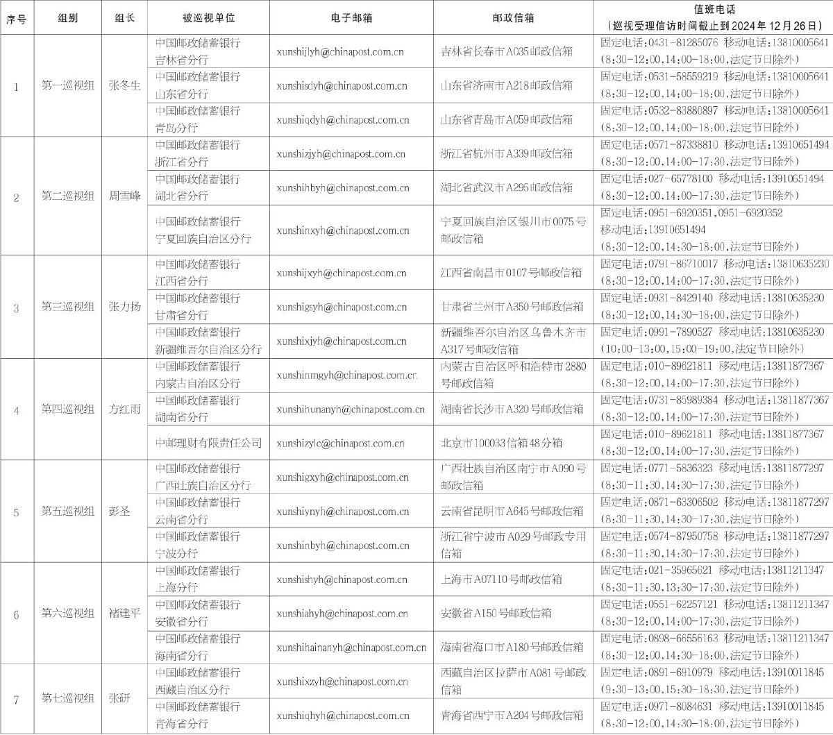 中國郵政集團有限公司黨組2024年第二批巡視進駐信息一覽表
