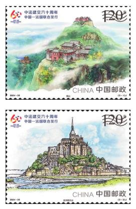10月18日,《中法建交六十周年》(與法國聯合發行)紀念郵票發行。該套郵票一套2枚,郵票圖案名稱分別為“1.泰山”和“2.圣米歇爾山”。