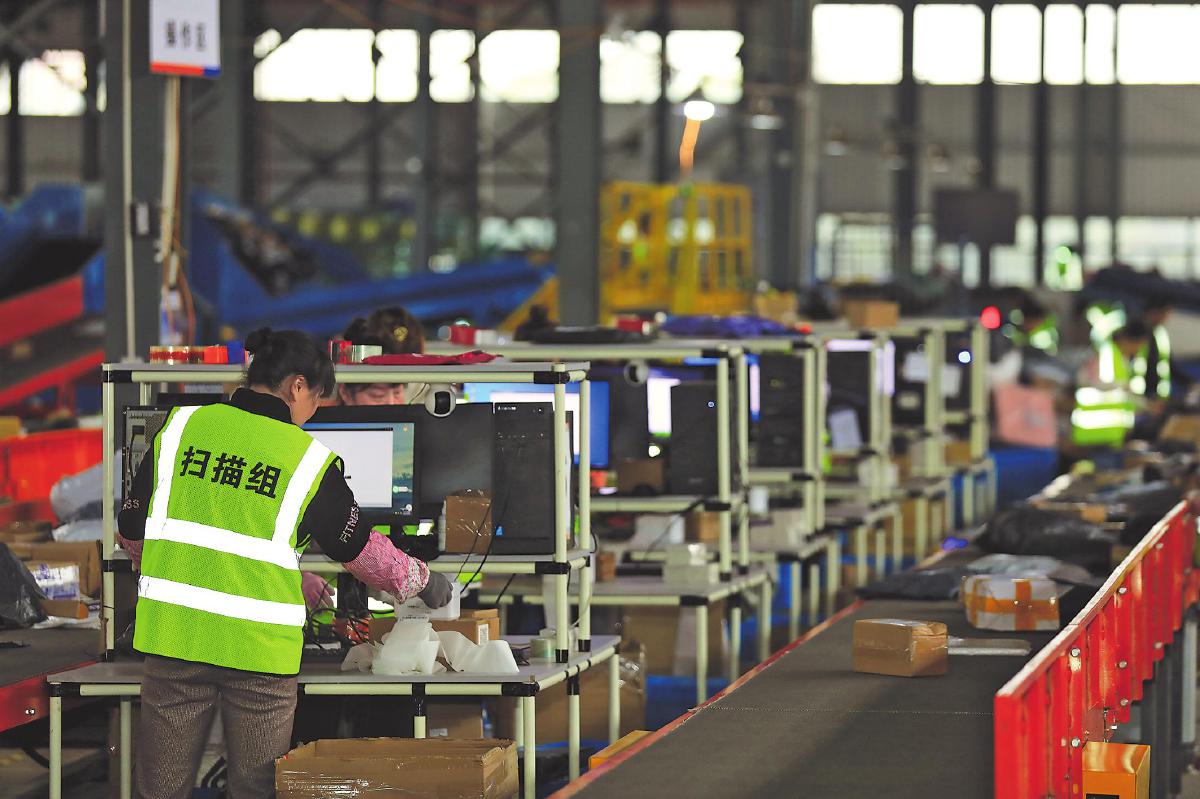工作人員將入庫后的郵件逐件掃描換單,一件件貼上郵政面單的包裹將通過專車發往新疆。 □韓穎 攝