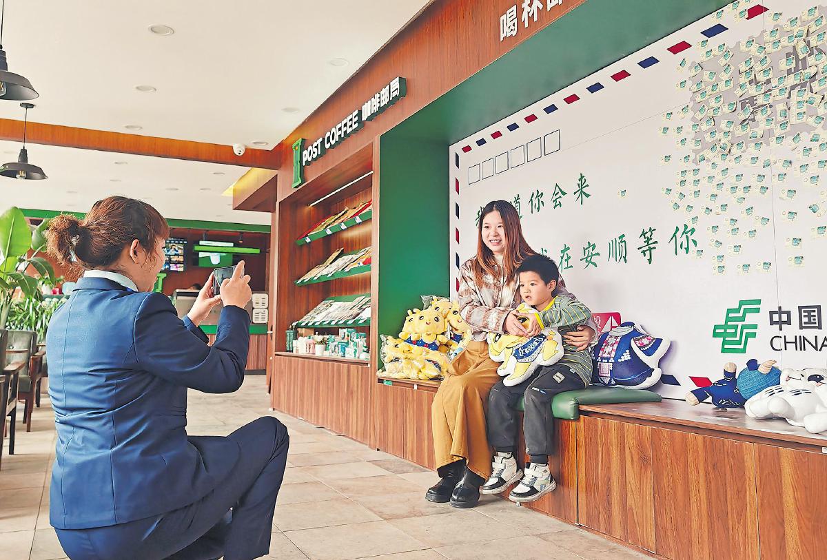 伴隨貴州省安順市打造城市旅游品牌的步伐,安順市郵政分公司深入推進文旅融合,與安順旅游集團文創商品發展有限公司攜手打造“郵局咖啡·遇見安旅店”。店內裝修兼具郵政特色、古城風格與現代風情,設有文創展示、郵局文化、網紅打卡、印章加蓋及DIY明信片等區域,為游客提供獨特文化體驗,成為安順古城旅游的新地標。圖為11月8日,郵政工作人員在為游客打卡拍照。