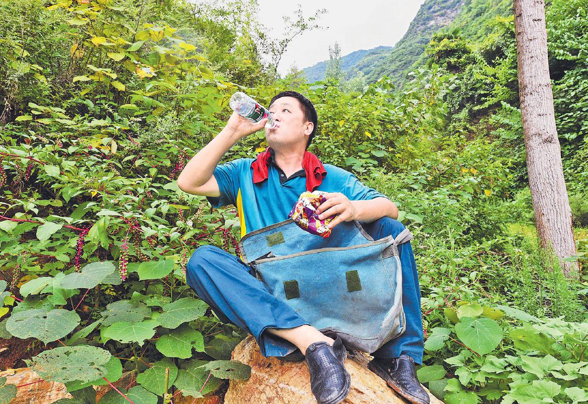 黃德印在投遞路上席地而坐,用礦泉水和方便面填飽肚子。