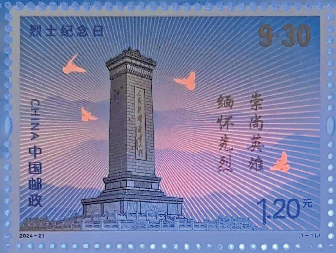 《烈士紀(jì)念日》紀(jì)念郵票使用膠雕聯(lián)合印刷,采用一版雙色雕刻工藝。其中,用黑色雕刻展示人民英雄紀(jì)念碑的莊嚴(yán)和厚重,同時(shí)采用特種雕刻閃金油墨雕刻“緬懷先烈崇尚英雄”八個(gè)大字。在陽光下觀察,閃亮的金色文字光澤奪目、熠熠生輝,配以膠印細(xì)膩、柔和的漸變背景圖案,使膠印、雕刻兩種方式發(fā)揮出最佳表現(xiàn)力。