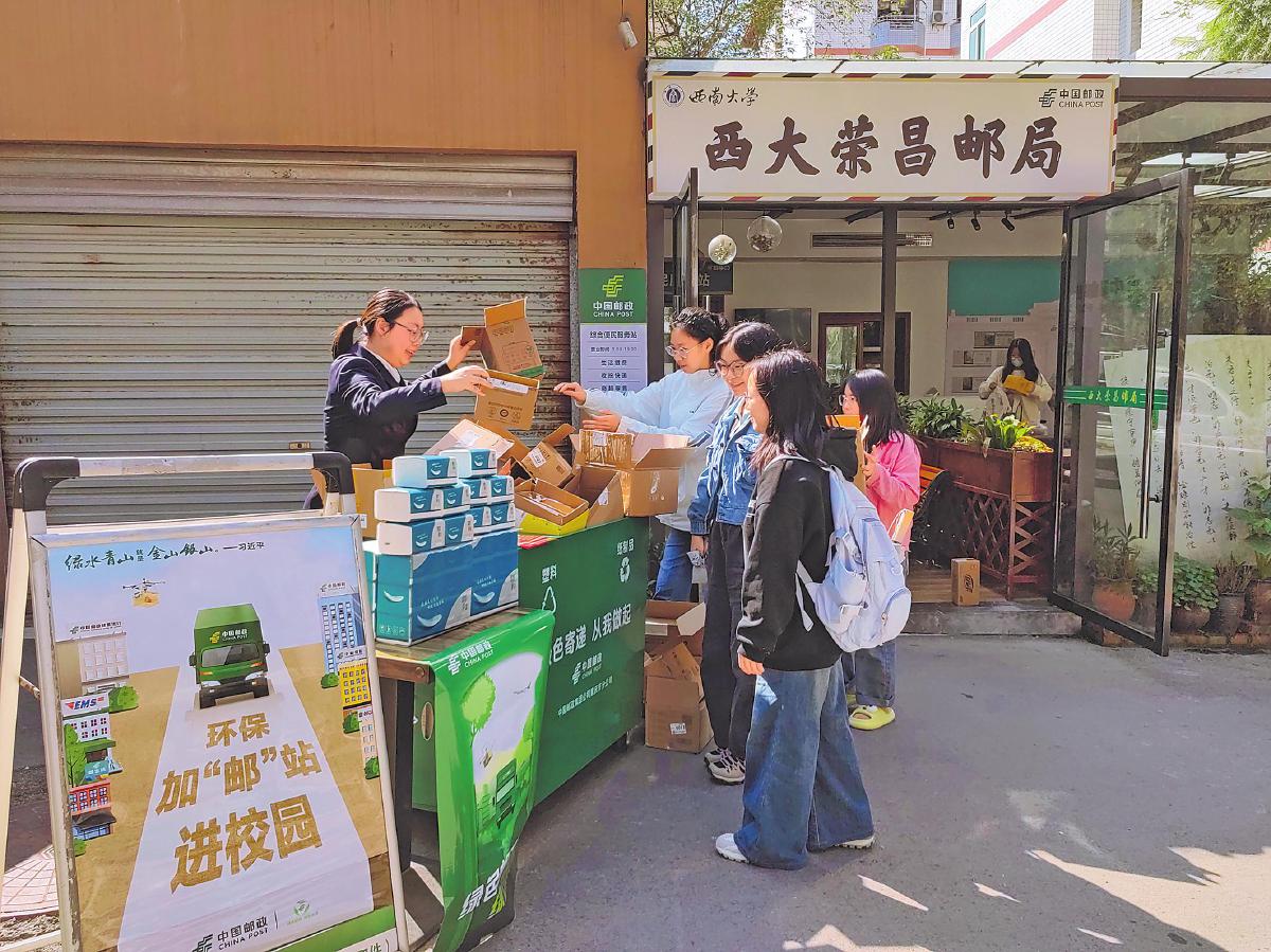 重慶市榮昌區郵政分公司開展“環保加‘郵’站進校園”活動,參與者可用舊紙箱換取奶茶一杯。