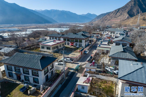 1月19日,西藏林芝市“郵快合作”新配備的郵遞車穿行在鄉(xiāng)村小巷(無人機照片)。