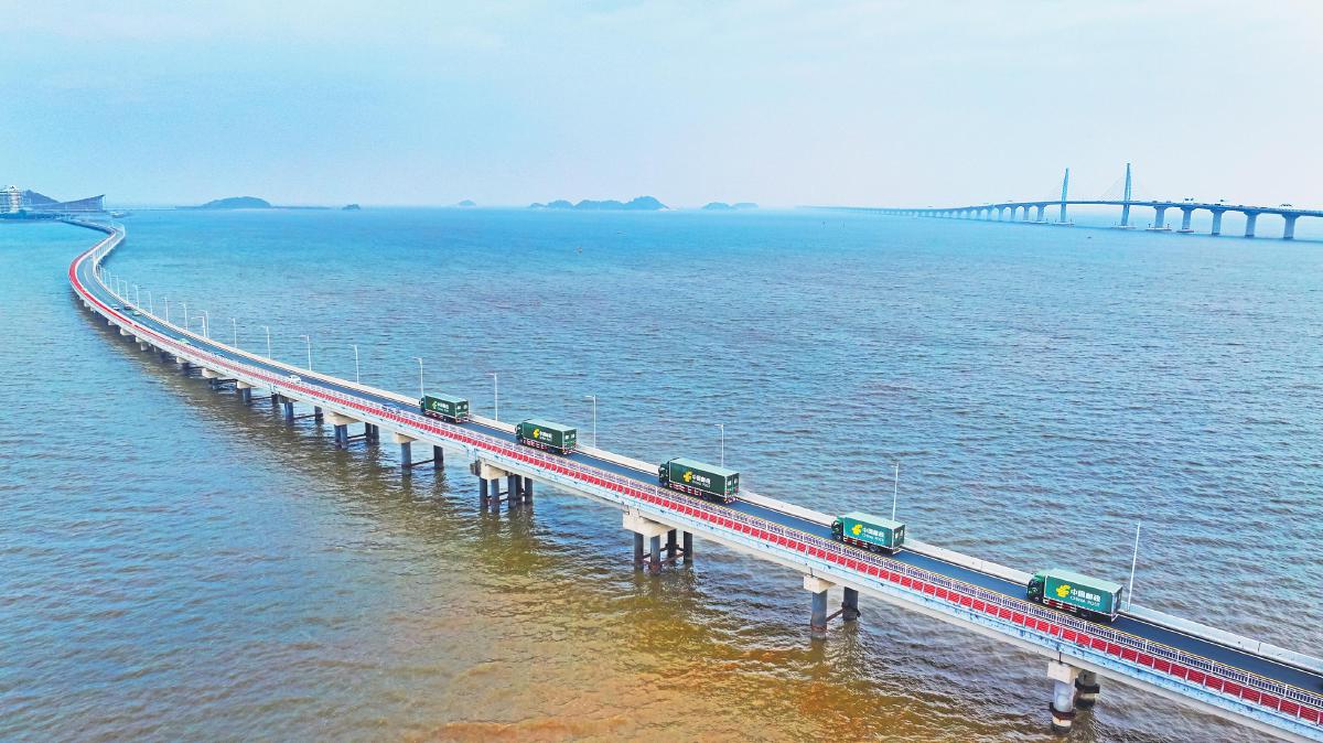 郵政車隊(duì)在港珠澳大橋的引橋上有序前行,宛如一條綠色的絲帶連接著粵港澳大灣區(qū)。郵政服務(wù)為區(qū)域內(nèi)的物流運(yùn)輸和經(jīng)濟(jì)交流提供了有力支持,促進(jìn)了大灣區(qū)物流一體化進(jìn)程,助力區(qū)域經(jīng)濟(jì)的繁榮和發(fā)展。 □陳師 攝