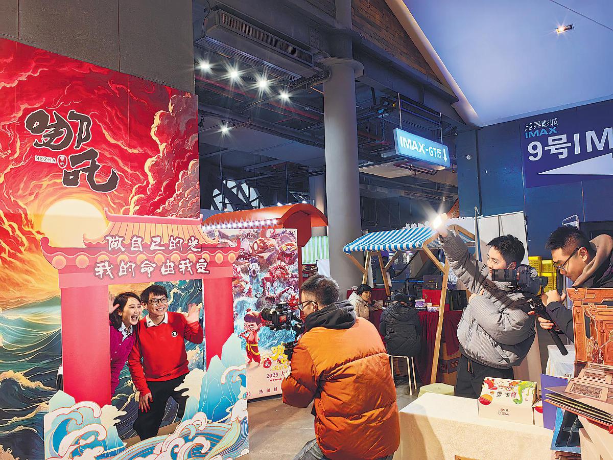 游客紛紛在“哪吒”主題墻前打卡。□楊冰潔 攝