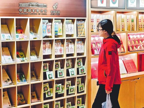 中國國家博物館主題郵局內陳列著以國博館藏為靈感的豐富郵品,游客可以用不同文物主題的郵戳蓋章留念,感受集郵文化的獨特魅力。