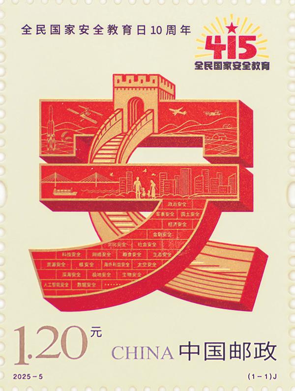 該郵票圖案采用醒目、莊重的紅金配色為主色調(diào),以漢字“安”與安居樂業(yè)的人民、意象化的長城、城鄉(xiāng)建筑、麥穗、火箭、飛機(jī)、高鐵等元素進(jìn)行同構(gòu)設(shè)計(jì),構(gòu)成一幅社會穩(wěn)定繁榮的美好畫面,同時融入全民國家安全教育標(biāo)識圖案,體現(xiàn)出大安全理念和國家安全教育主題。國家安全目前所涉及的多個重點(diǎn)領(lǐng)域采用一塊塊磚石壘砌,寓意總體國家安全觀內(nèi)涵豐富,象征著新時代國家安全堅(jiān)如磐石。郵票印制細(xì)節(jié)清晰自然,圖中金字采用鏤空套印,既確保金字的飽滿明亮,也大幅提升批量印刷的穩(wěn)定性。紫外燈下,紅墨呈現(xiàn)鮮艷紅熒光效果,層次分明,增強(qiáng)了郵票的防偽性與觀賞性。