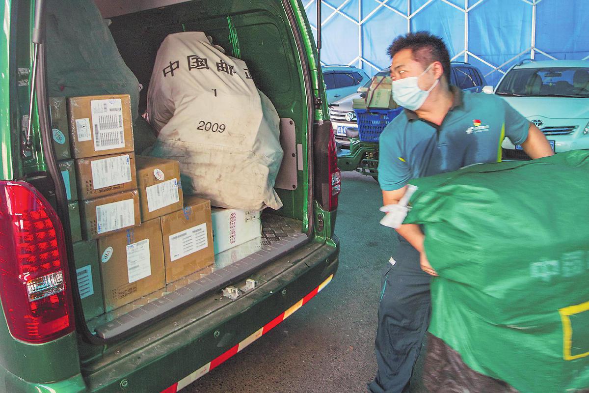 徐龍將郵件裝進(jìn)郵車(chē)。