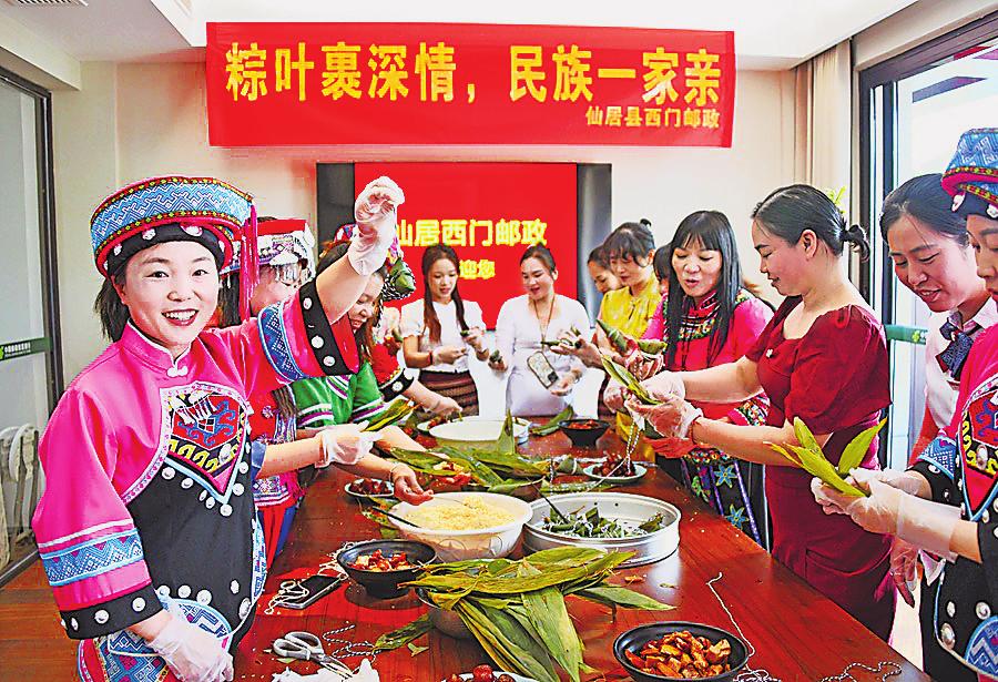 5月24日,浙江省仙居縣郵政分公司西門營業(yè)所聯(lián)合仙居縣政協(xié)少數(shù)民族界別、工會(huì)界別,共同開展“粽葉飄香迎端午 民族團(tuán)結(jié)一家親”主題活動(dòng)。活動(dòng)現(xiàn)場(chǎng),來自苗族、侗族、畬族等10個(gè)民族的30余名同胞身著民族盛裝,與郵政員工、政協(xié)委員們共聚一堂,包粽子、迎端午、話家常。