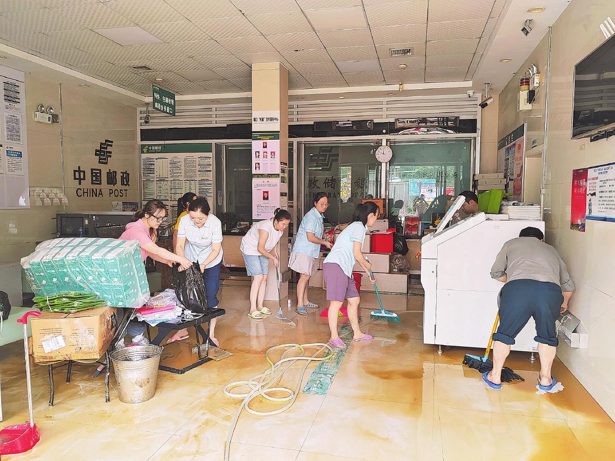 洪水退去,古州北路營業所員工抓緊清掃大廳,準備恢復營業。
