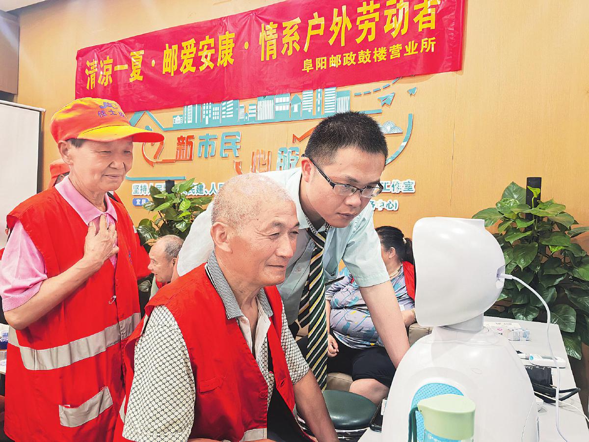 據(jù)了解,進(jìn)入夏季以來(lái),阜陽(yáng)市郵政分公司37處“郵愛驛站”全部開啟“清涼模式”,為環(huán)衛(wèi)工、快遞員、外賣配送員、出租車駕駛員等戶外勞動(dòng)者提供歇腳、喝水、納涼等一攬子貼心服務(wù)。圖為郵政工作人員幫助環(huán)衛(wèi)工人利用智能視頻醫(yī)生系統(tǒng)在線連接知名醫(yī)院的專家進(jìn)行問診。