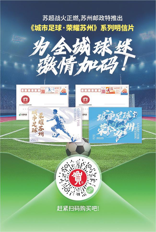 蘇州郵政高度重視“蘇超”賽事品牌內(nèi)涵,統(tǒng)籌部署賽事服務(wù)方案。吳江區(qū)郵政分公司第一時間主動對接賽事主辦方蘇州市體育局,率先斬獲“蘇超”蘇州賽區(qū)官方獨家授權(quán),成為賽區(qū)唯一指定紀(jì)念郵品服務(wù)運營商。郵政專業(yè)團隊結(jié)合賽事視覺識別系統(tǒng)和蘇州地域文化,設(shè)計開發(fā)《城市足球 榮耀蘇州》系列明信片A、B兩套共12款。所有明信片均加印賽事官方授權(quán)標(biāo)識,具備唯一性與權(quán)威性,滿足收藏、饋贈和球迷助威等多樣需求。賽事舉辦期間,蘇州郵政在場館外設(shè)立“蘇超”主題郵局,現(xiàn)場展示與蓋戳發(fā)售,成為球迷合影打卡與文化消費的熱門地標(biāo),高效助力賽事文化傳播。