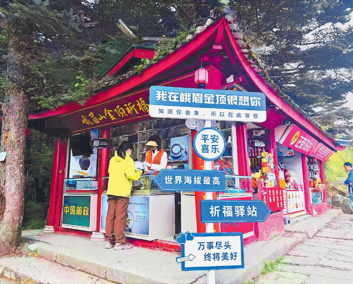 “我們不僅是一座郵局,更是祈福的驛站。”樂山市郵政分公司郵政業務部負責人徐錦介紹道。金頂祈福郵局深度挖掘峨眉山濃厚的佛教文化與壯麗的自然景觀,精心設計了一系列祈福主題產品,如禪語和佛具等佛教元素紀念章、峨眉四季風光明信片……方寸之間,意境悠遠,游客在寄送祝福的同時,更能感受峨眉山獨特的文化底蘊和自然之美。