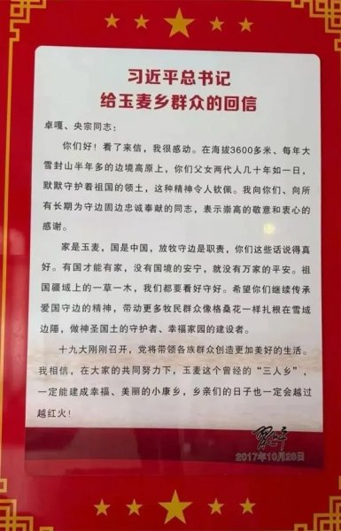 跟隨卓嘎的腳步,采訪組走進玉麥鄉政府,在左邊墻上的大幅展框里,是習近平總書記給玉麥鄉群眾的回信,“祖國疆域上的一草一木,我們都要看好守好。希望你們繼續傳承愛國守邊的精神,帶動更多牧民群眾像格桑花一樣扎根在雪域邊陲,做神圣國土的守護者、幸福家園的建設者”。