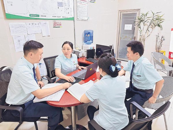 李霞(左二)和員工討論工作方案。