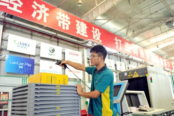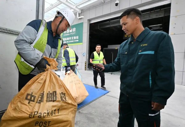 在新疆霍爾果斯國(guó)際郵件交換站,中國(guó)郵政工作人員(右一)在為即將交換到哈薩克斯坦郵政的郵包掃碼轉(zhuǎn)運(yùn)。據(jù)了解,霍爾果斯國(guó)際郵件交換站于2022年7月正式運(yùn)營(yíng),以進(jìn)出口物流渠道為支持,為跨境電商產(chǎn)業(yè)鏈上下游提供倉(cāng)儲(chǔ)和快遞物流綜合解決方案。承運(yùn)中國(guó)至中亞多國(guó)、俄羅斯以及歐洲國(guó)家的出口國(guó)際郵件。3年來(lái),累計(jì)國(guó)際郵件交換量2026噸(9月11日攝)。新華社記者 李賀 攝