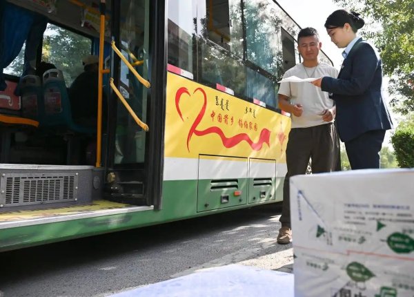 新疆伊犁州米糧泉鄉(xiāng)米糧泉村郵政所工作人員(右)在同公交車司機(jī)交接郵件。近年來(lái),伊犁州郵政分公司通過(guò)和公交公司合作,利用公交車的冗余載能將郵件投送到村級(jí)郵政所,為當(dāng)?shù)馗髯迦罕妿?lái)便利(9月8日攝)。新華社記者 李賀 攝