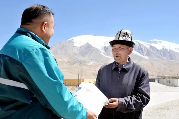 投遞員阿克阿不都賽米·賽買提(左)把包裹送到新疆克孜勒蘇柯?tīng)柨俗巫灾沃莅⒖颂湛h布倫口鄉(xiāng)布倫口村夏迪別克·排爾慢手中。郵路延伸到雪山腳下,讓生活在邊疆的各族民眾也能享受到和城市居民一樣快捷方便的郵政服務(wù)(9月9日攝)。新華社發(fā)