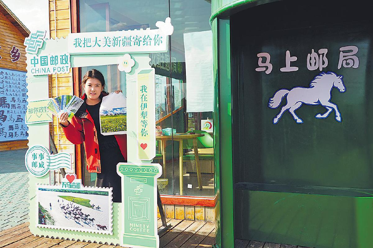 在昭蘇縣天馬文化園,主題郵局以豐富多彩、獨具創(chuàng)意的文創(chuàng)服務(wù)為游客留下美好回憶。