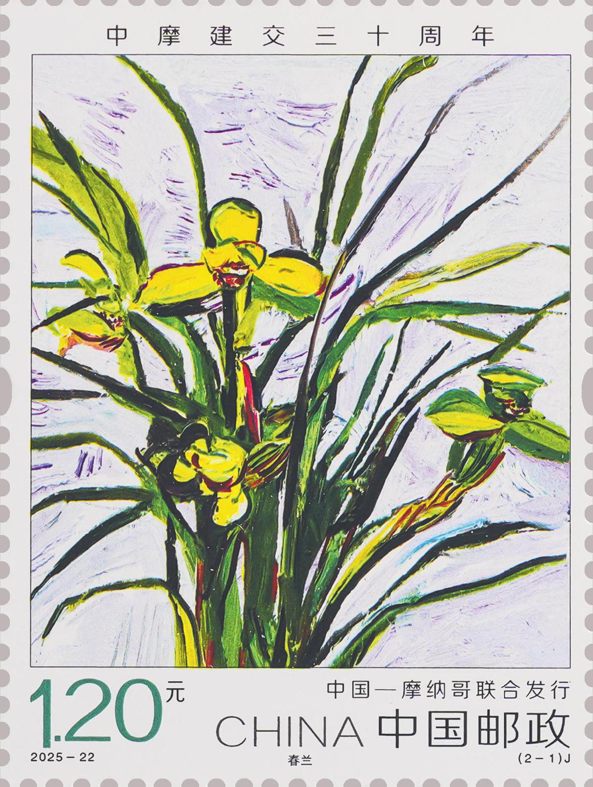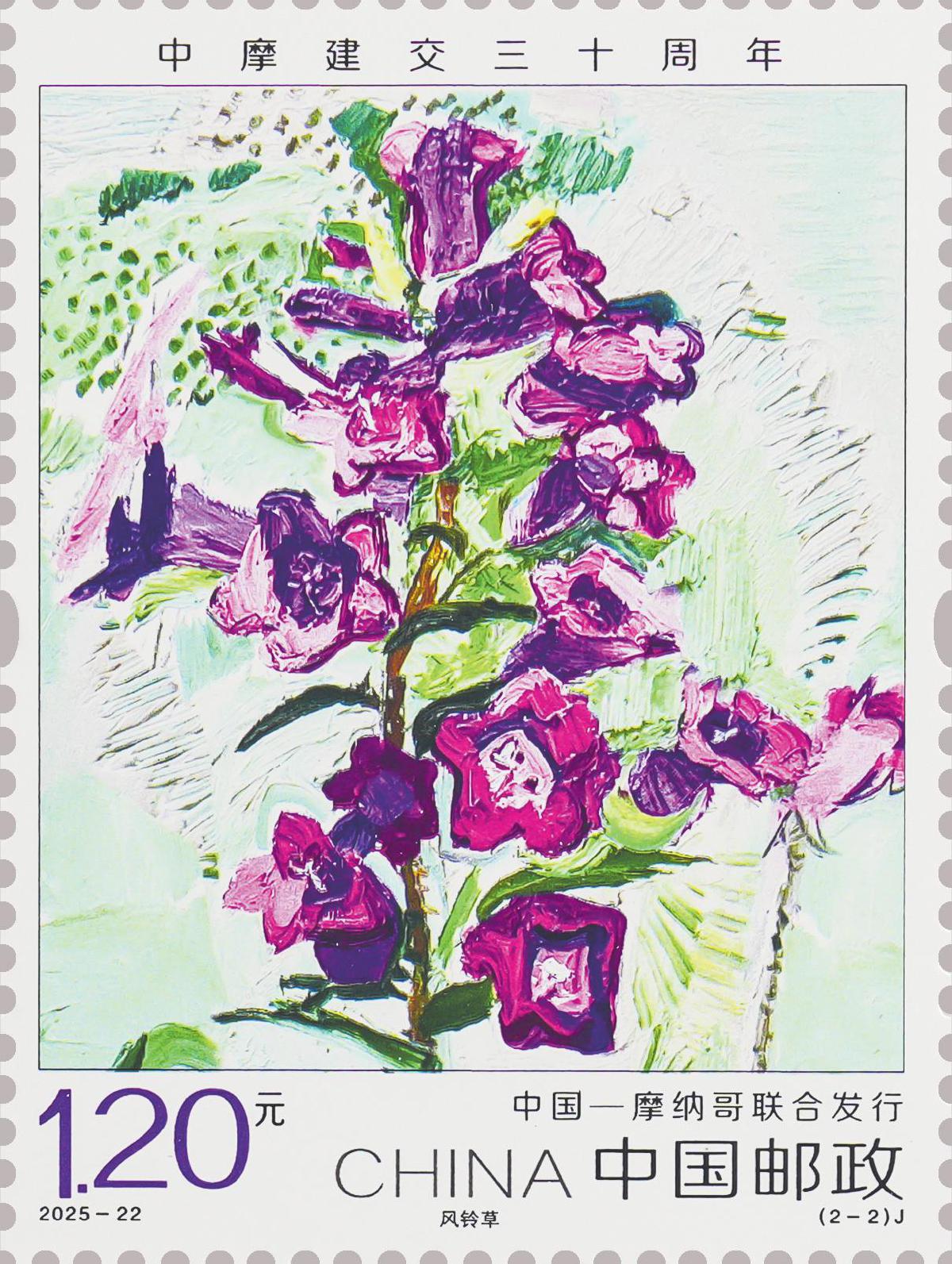 本套郵票分別選用具有兩國民族特色和深厚文化內涵的花卉,中國選用栽培歷史悠久的春蘭,摩納哥選用美麗靈動的風鈴草,兩種花卉彰顯出生態文明的內在價值與精神追求。郵票圖案采用油畫表現方式,設計師通過大膽的構圖、恣意的筆觸、靈活的色彩搭配,對具體的物象進行抽象提煉,從而營造出一種生動而富有生命力的畫面效果。兩枚郵票承載著“友誼長存”的深層寓意,希望中摩關系不斷取得新進展,更好造福兩國人民。