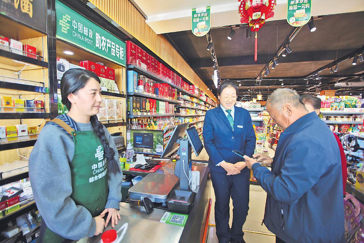 五原縣郵政分公司在“雙生態(tài)圈”打造中,攜手縣工業(yè)和信息化局,深度融入縣域商業(yè)體系建設(shè)項目,爭取政府補(bǔ)貼資金,選取全縣11個鄉(xiāng)鎮(zhèn)的11處商超,全部升級改造為郵政標(biāo)準(zhǔn)化綜合便民服務(wù)站點。采訪組在銀定圖鎮(zhèn)福多樂天天惠超市看到,面積達(dá)425平方米的超市寬敞明亮、顧客盈門,貨品琳瑯滿目,“天天3·15 放心郵樂購”的標(biāo)志醒目,快遞存放處擺滿了待取的包裹。“環(huán)境好、人氣旺,營收比改造前增加了近三成。”超市老板李浩喜笑顏開,特意將采訪組領(lǐng)到新建的冷庫。冷庫里擺滿了牛羊肉等生鮮產(chǎn)品,他說再也不用為存放問題發(fā)愁了,村民隨時需要,自己隨時有貨。