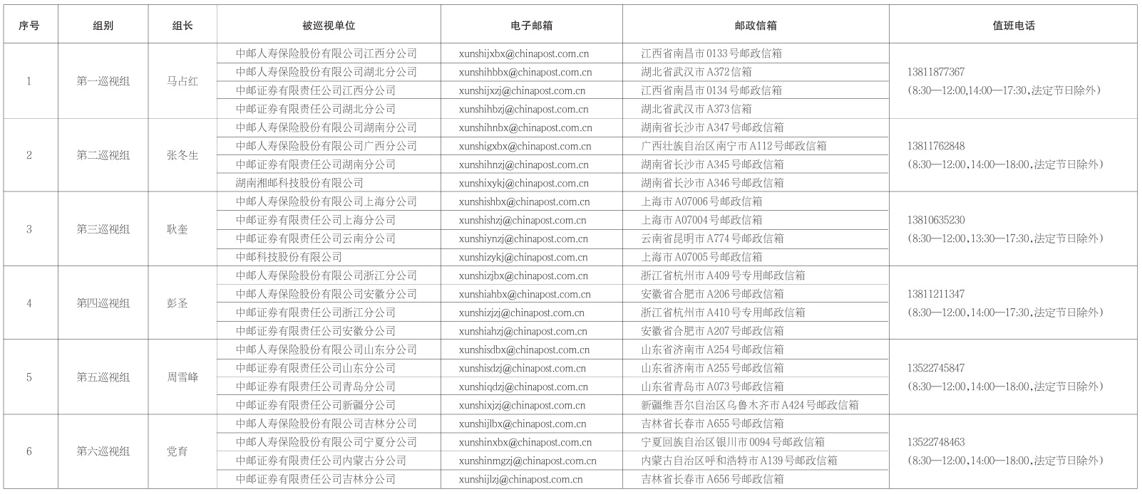 中國郵政集團有限公司黨組2025年第二批巡視進駐信息一覽表