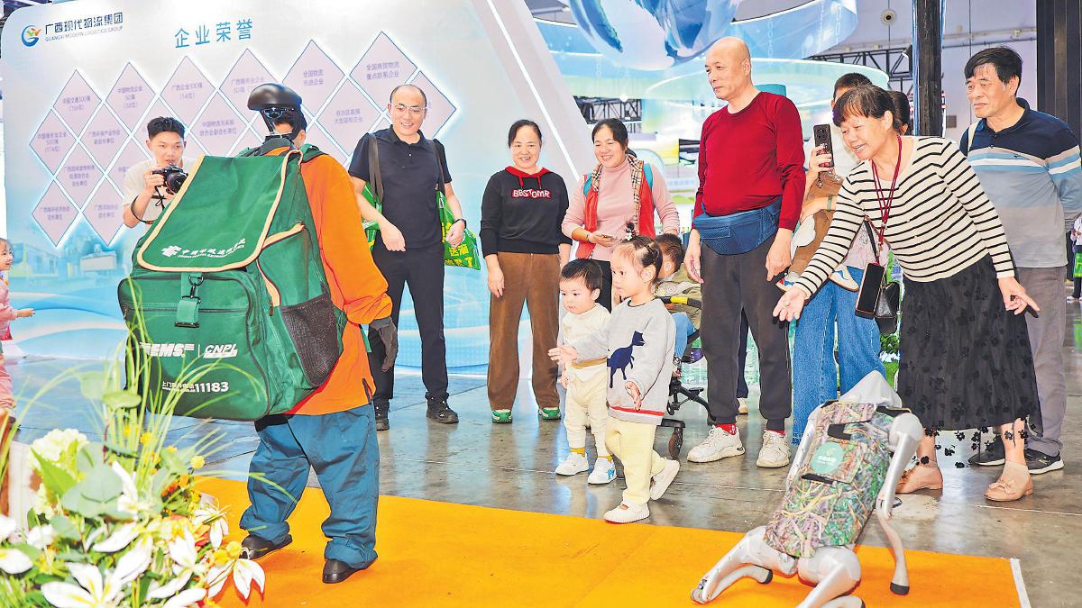 在博覽會郵政展臺前,廣西郵政推出的機(jī)器人、機(jī)器狗與觀眾友好互動。
