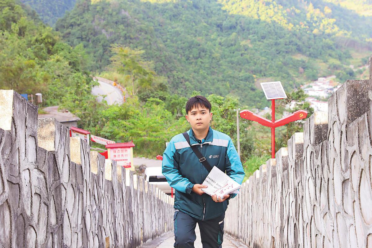 正值“雙11”,鄉親們搶購的冬被、毛衣、暖手寶等包裹接踵而來。11月10日,廣西壯族自治區那坡縣平孟郵政所投遞員黃河振裝好包裹,跨上摩托車輕啟油門,開始了一天的工作,摩托車低沉的引擎聲在平孟鎮的晨霧中散開。