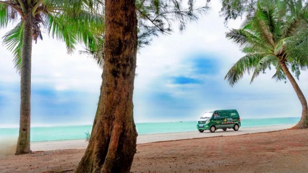 椰林伴海,郵車穿行于萬尾金灘的濱海道