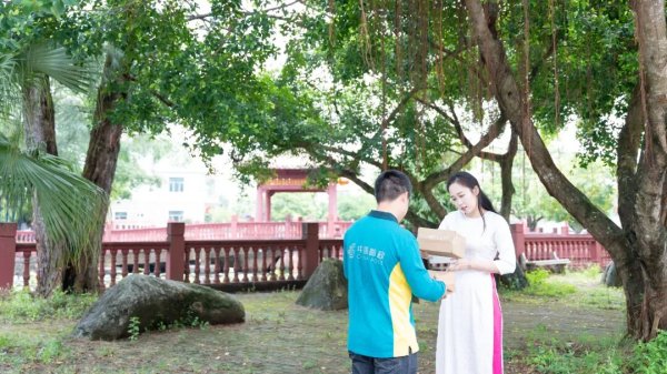 京族村寨中,身著民族服飾的姑娘接過投遞員送來的包裹