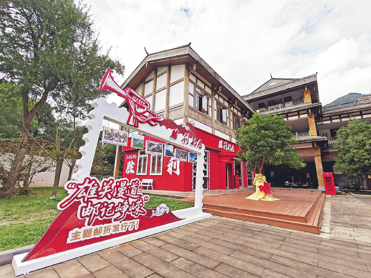 “勝利郵局”與景區合營,設計極具巧思:大門是郵筒造型,寓意“從勝利走向勝利”;室外設計了一面文化墻,有以時間輪盤的形式再現“四渡赤水”戰役的景象,有紀念郵票的展示區。