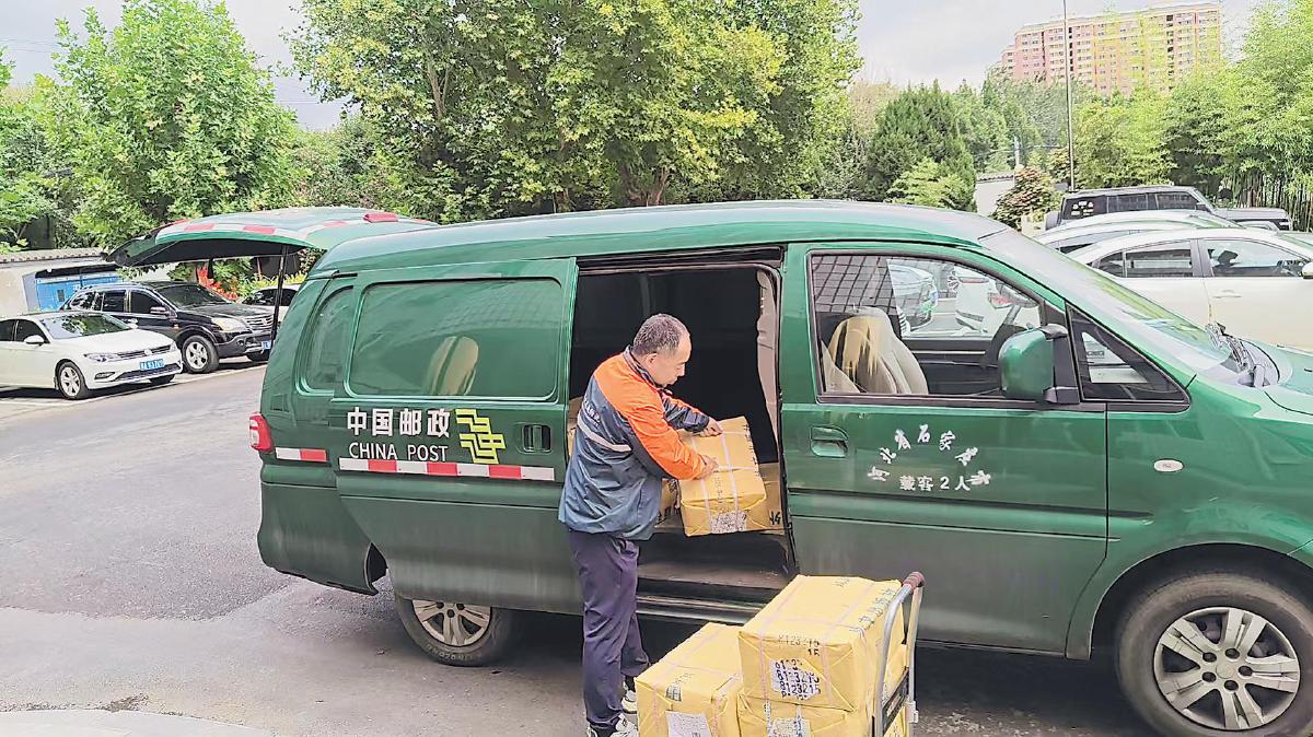 河北石家莊市分公司攬投員將重點政務圖書搬上郵車準備配送。