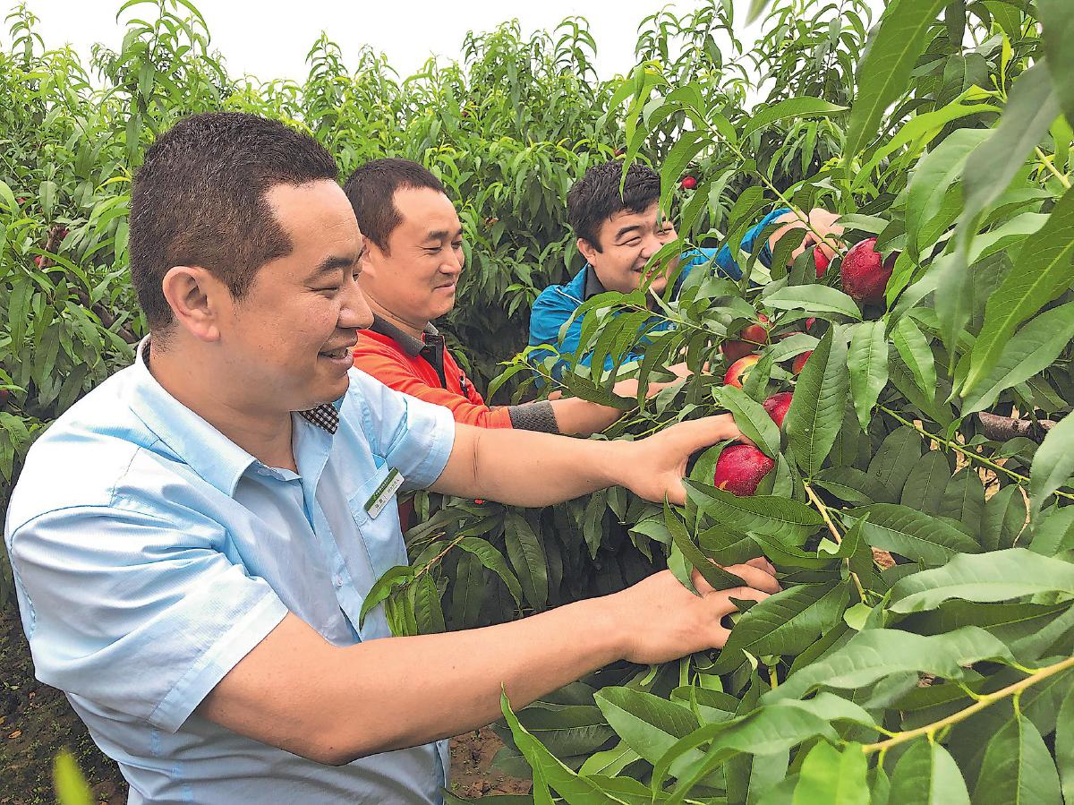 在天水市秦州區中梁鎮三灣村,郵政工作人員幫果農采摘花牛蘋果。